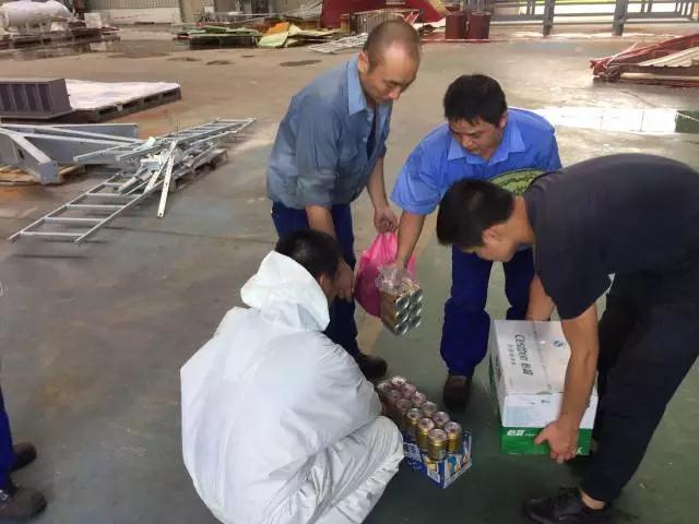 (管理部尽最快速度组织班车、食堂等后勤业务运作,工会为同事们购买了补充能量的面包干粮及解暑的清凉饮品。)