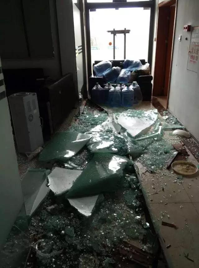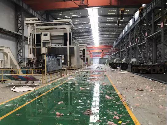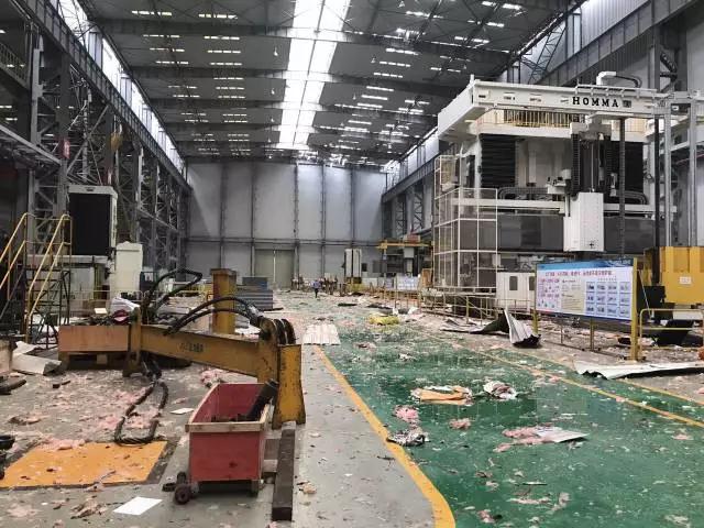 (办公楼的玻璃碎了一地,厂区内的树木断裂横倒)