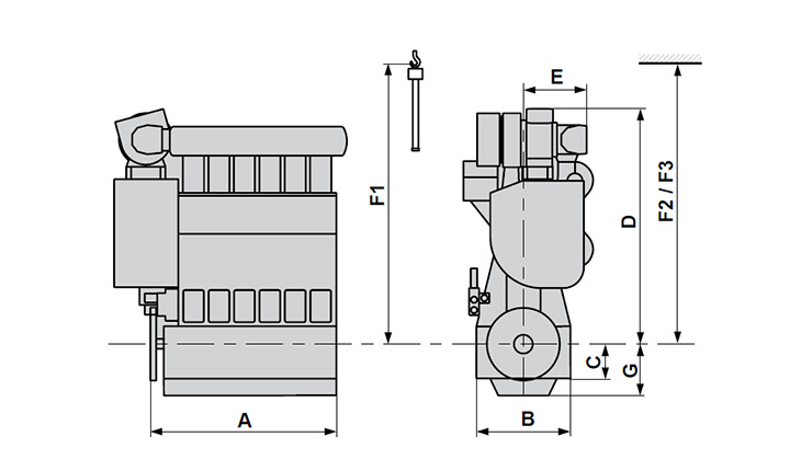 | F1: 垂直拆卸活塞时的最低高度 Min height for vertical removal F2: 使用双臂式吊车垂直拆卸活塞时的最低高度 Min height for vertical removal with double-jib crane F3: 使用双臂式吊车倾斜拆卸活塞时的最低高度 Min height for tilted removal with double-jib crane |