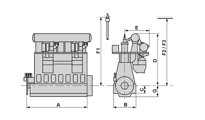 | F1: 垂直拆卸活塞时的最低高度 Min height for vertical removal F2: 使用双臂式吊车垂直拆卸活塞时的最低高度 Min height for vertical removal with double-jib crane F3: 使用双臂式吊车倾斜拆卸活塞时的最低高度 Min height for tilted removal with double-jib crane | |||||||||||||||||