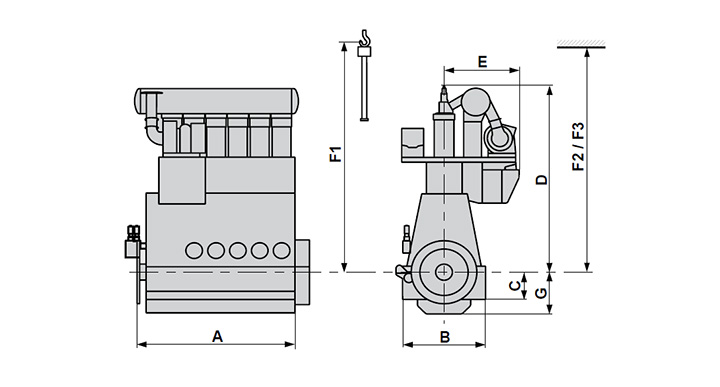 | F1: 垂直拆卸活塞时的最低高度 Min height for vertical removal F2: 使用双臂式吊车垂直拆卸活塞时的最低高度 Min height for vertical removal with double-jib crane F3: 使用双臂式吊车倾斜拆卸活塞时的最低高度 Min height for tilted removal with double-jib crane |